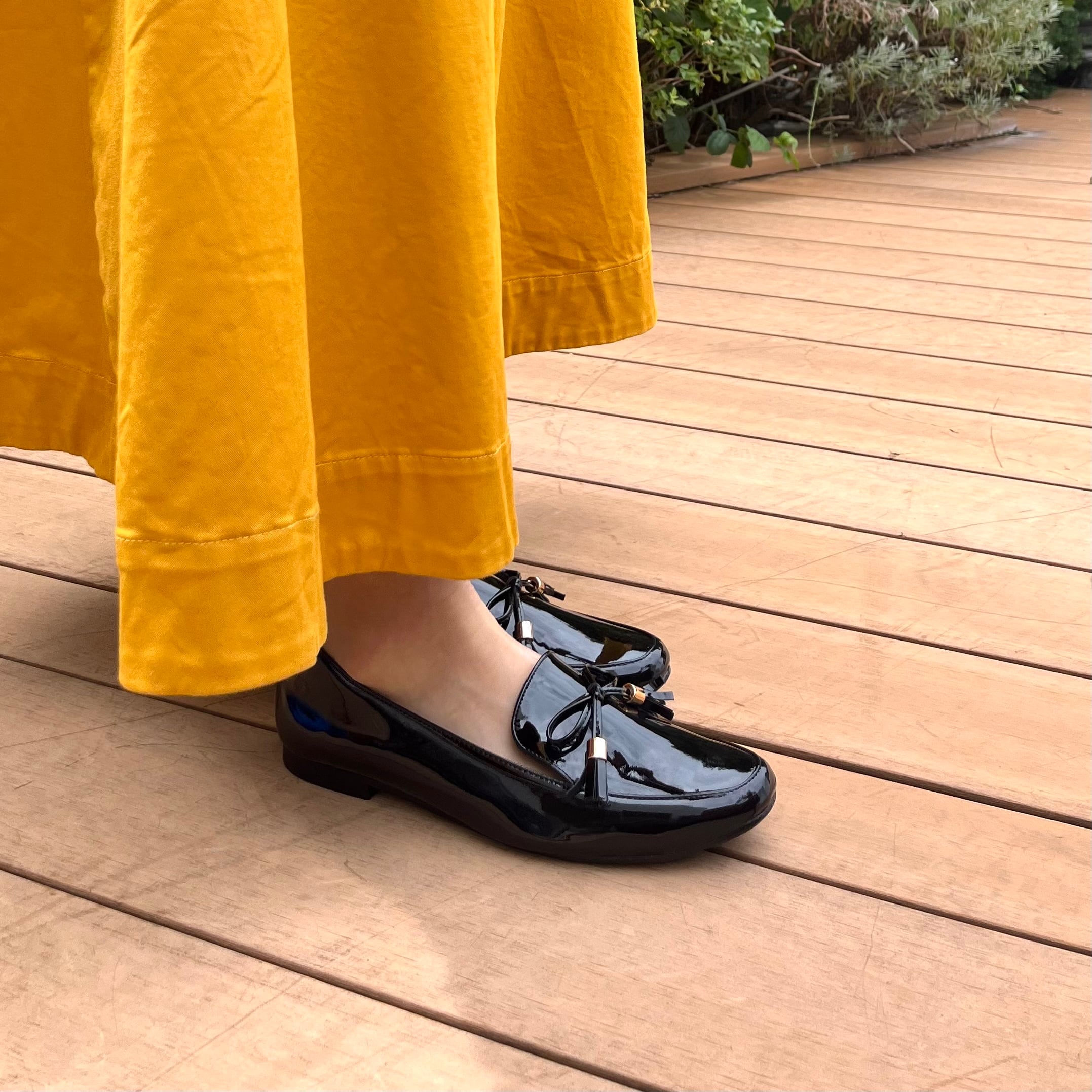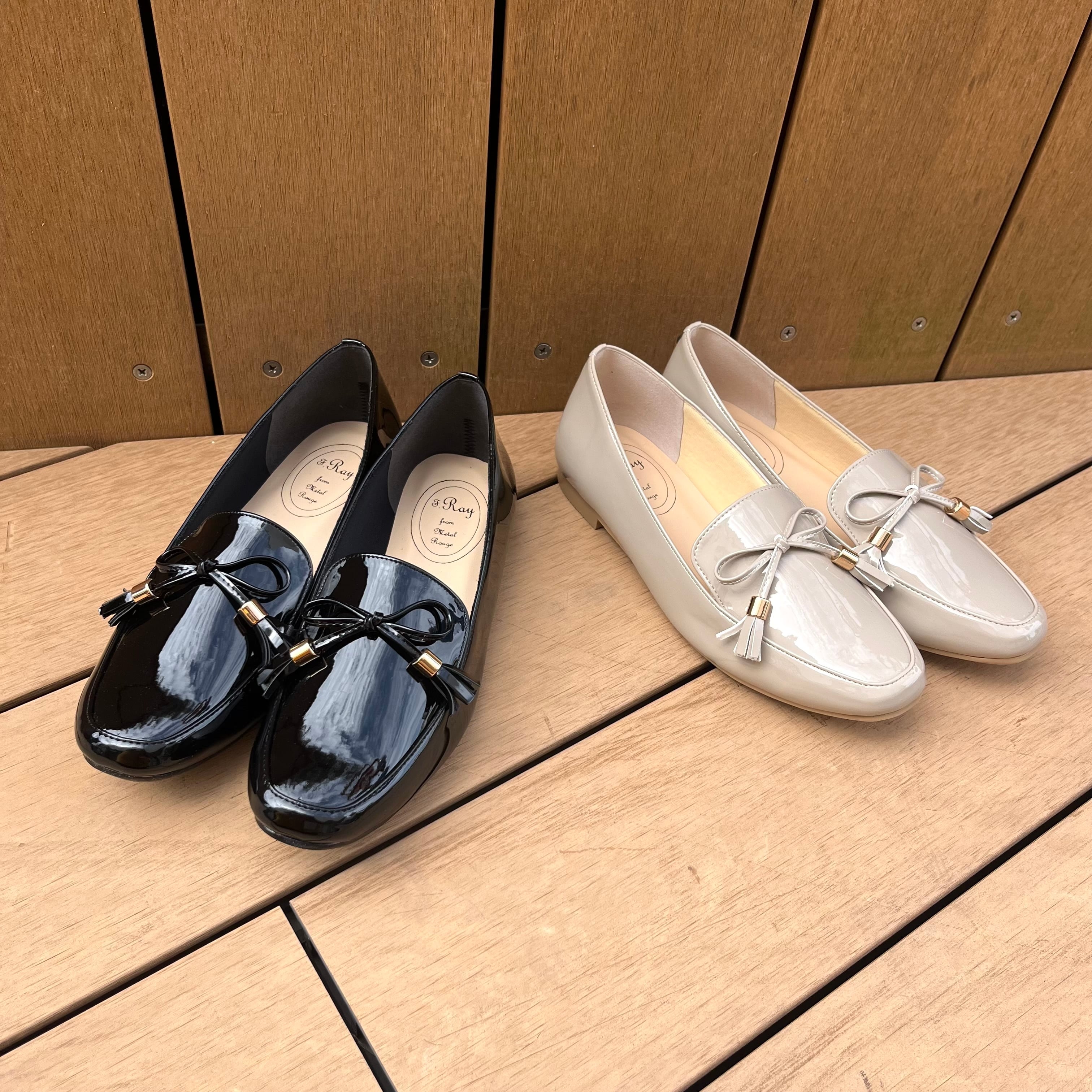 美しいエナメル仕上げにフリンジリボンが施されたデザインが足元を華やかに演出します。クラシックなローファーのシルエットに現代的なアレンジを加え、カジュアルからオフィススタイルまで幅広く活躍します。軽量な素材で作られているため、長時間の着用でも快適に過ごせるよう考慮されています。そして、心地よいインソールが足をしっかりとサポートします。