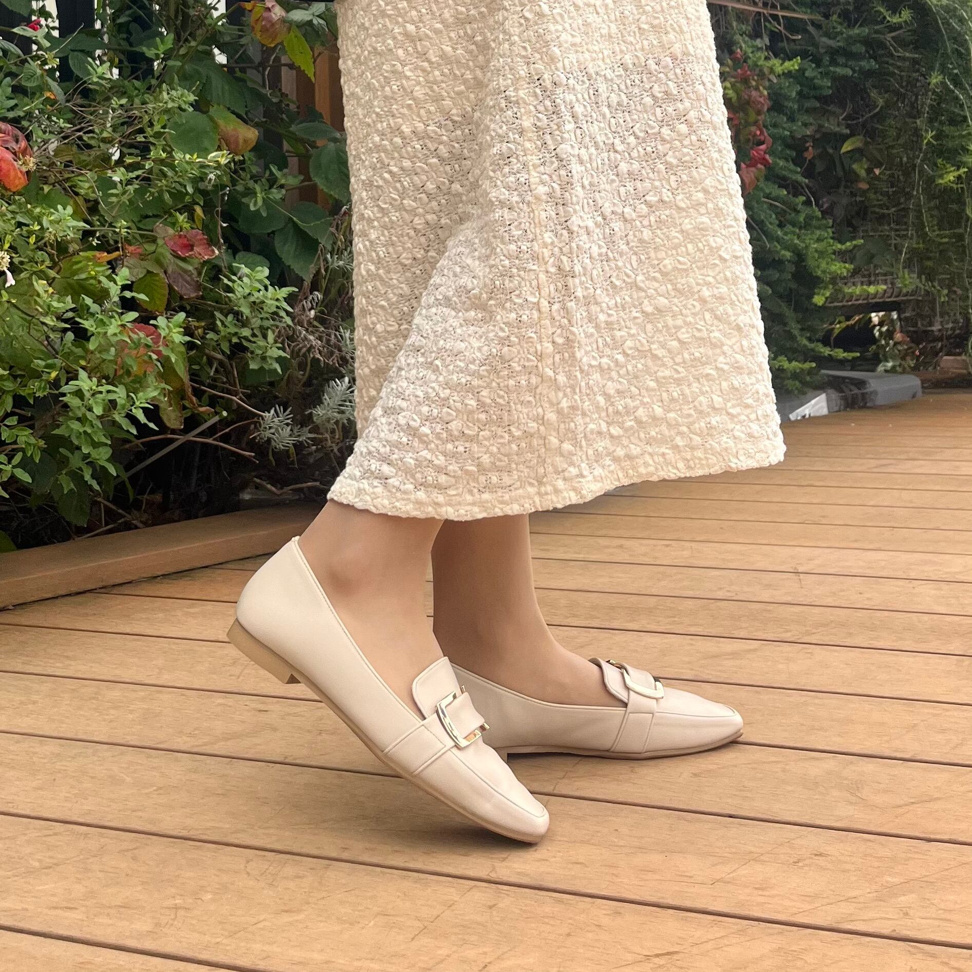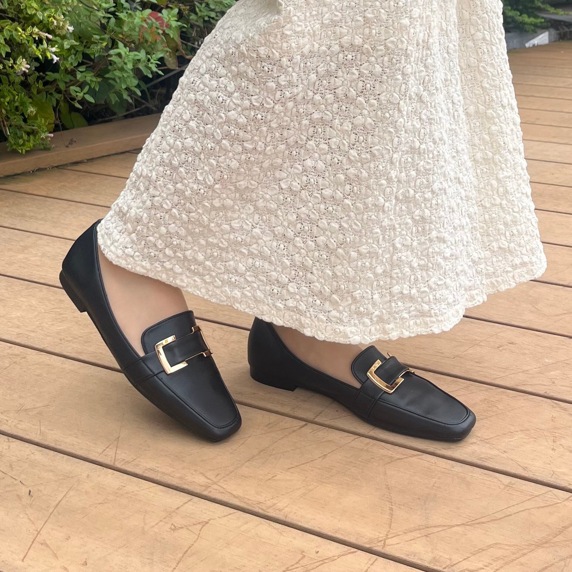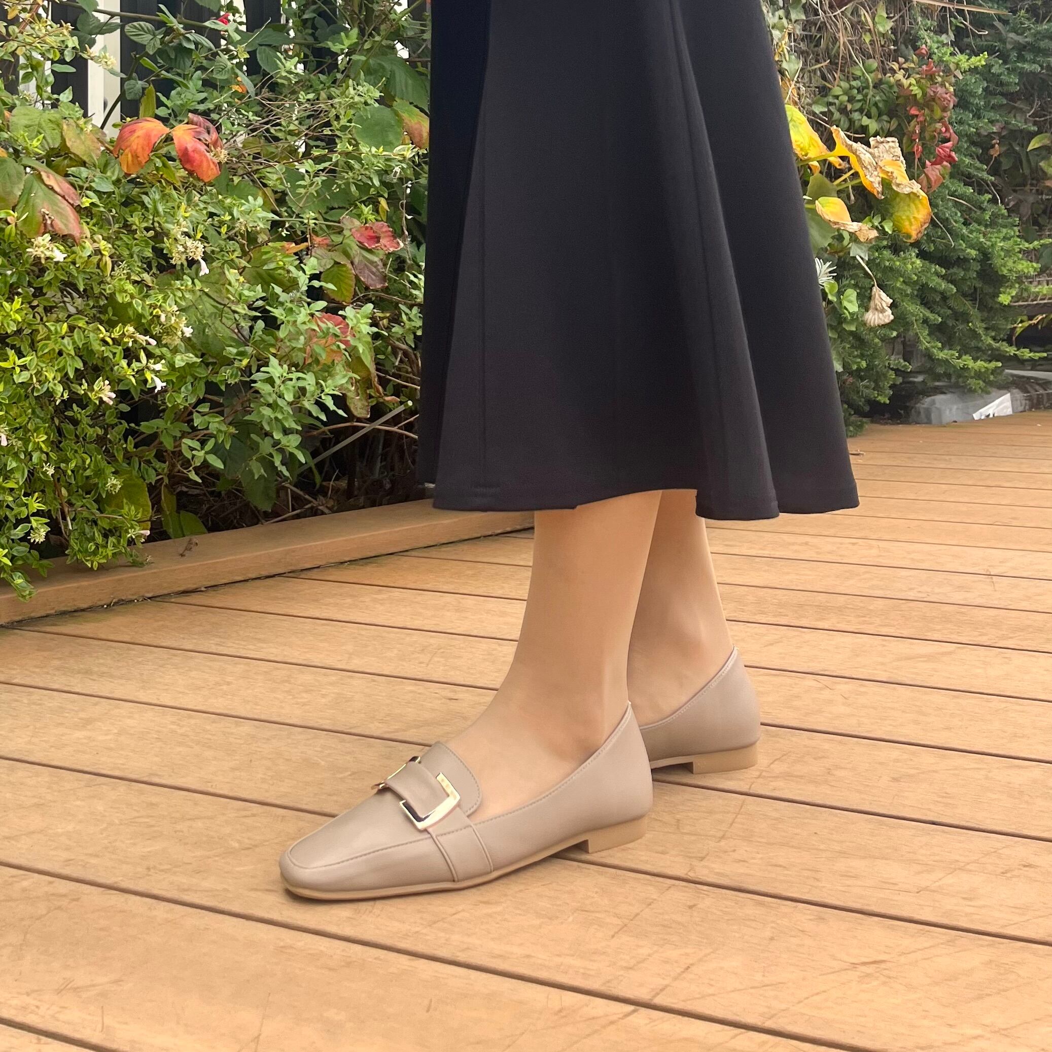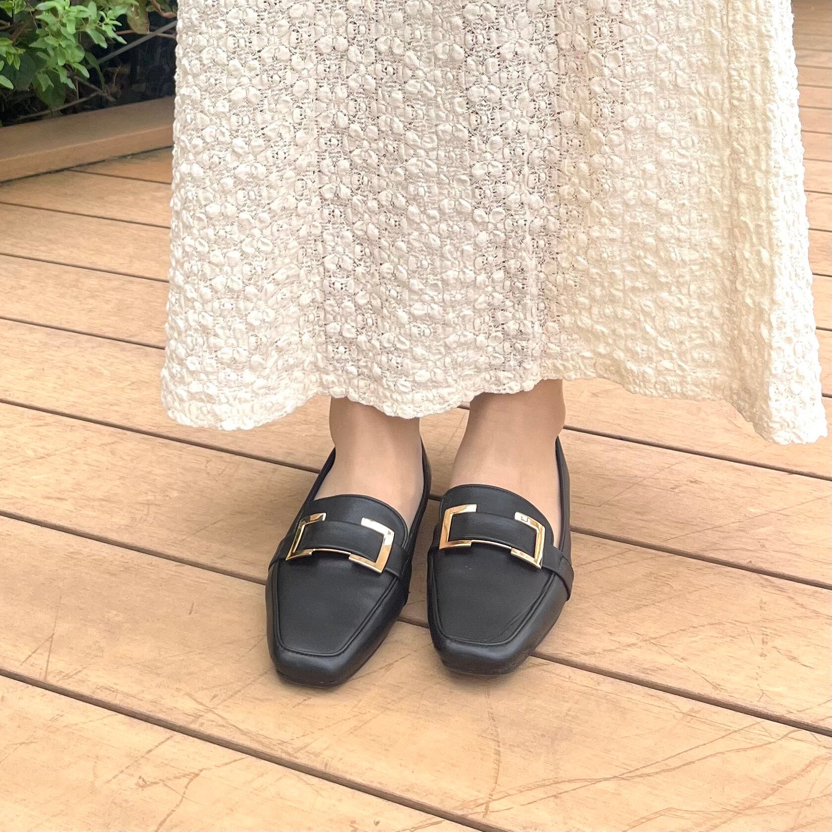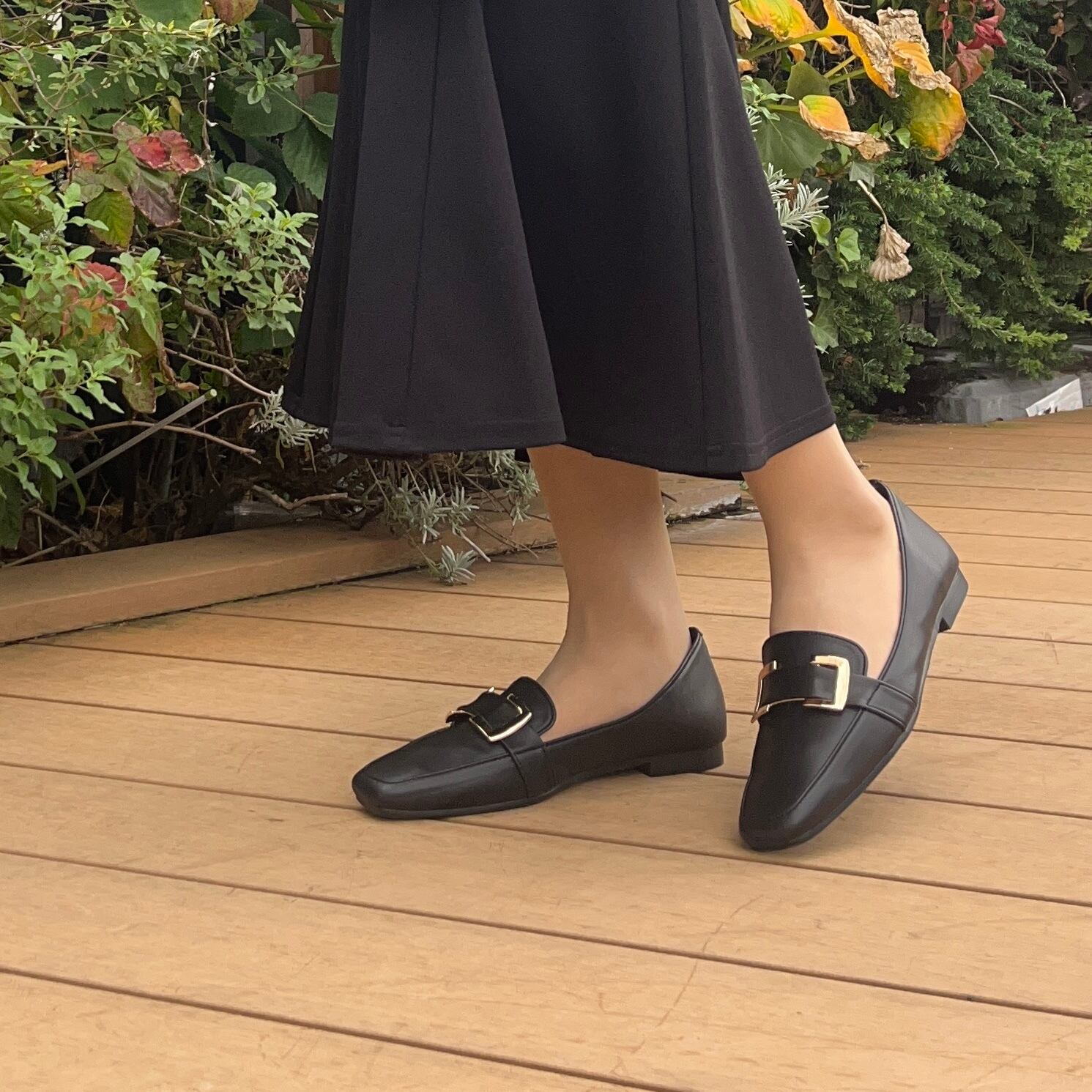 エレガントなスクエアバックルが魅力のデザインで足元にアクセントをプラスします。上品なシルエットと快適な履き心地を両立しており、デイリーユースから特別なシーンまで幅広く活躍します。柔らかい素材を使用しているため、長時間の着用でもストレスを感じることなく快適に過ごせます。そして、しっかりとしたインソールが足を優しく支えます。