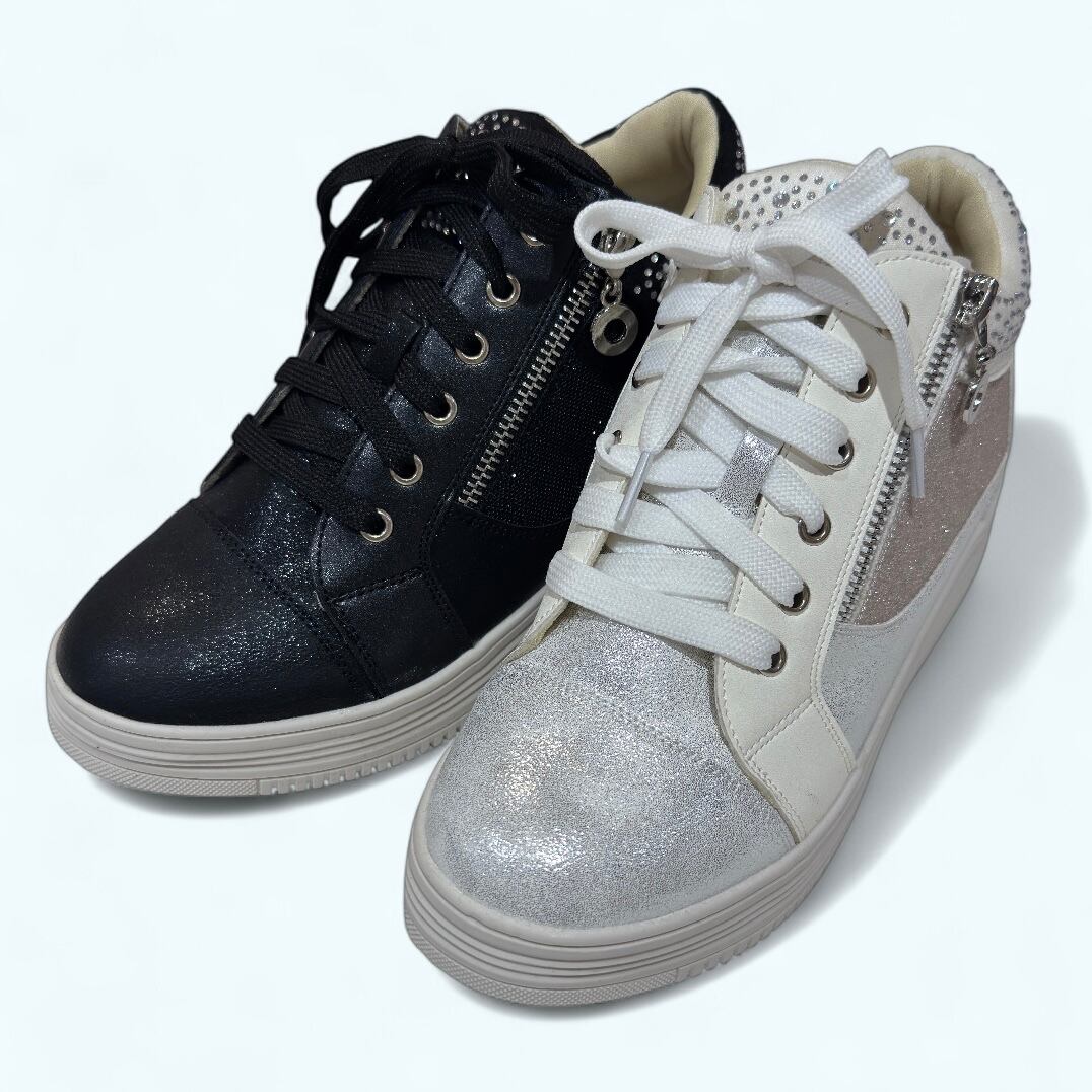 きらめくグリッター素材がポイントのインヒールスニーカーです。ファスナー付きで脱ぎ履きもラクラク。上品なデザインは、デイリースタイルに華やかさをプラスし、特別な日にもぴったりです。インヒールが絶妙なシルエットを作り出し、安心感を持ちながらもスタイリッシュな足元を演出します。快適な履き心地で、長時間の使用でも疲れにくく、しっかりとサポートします。