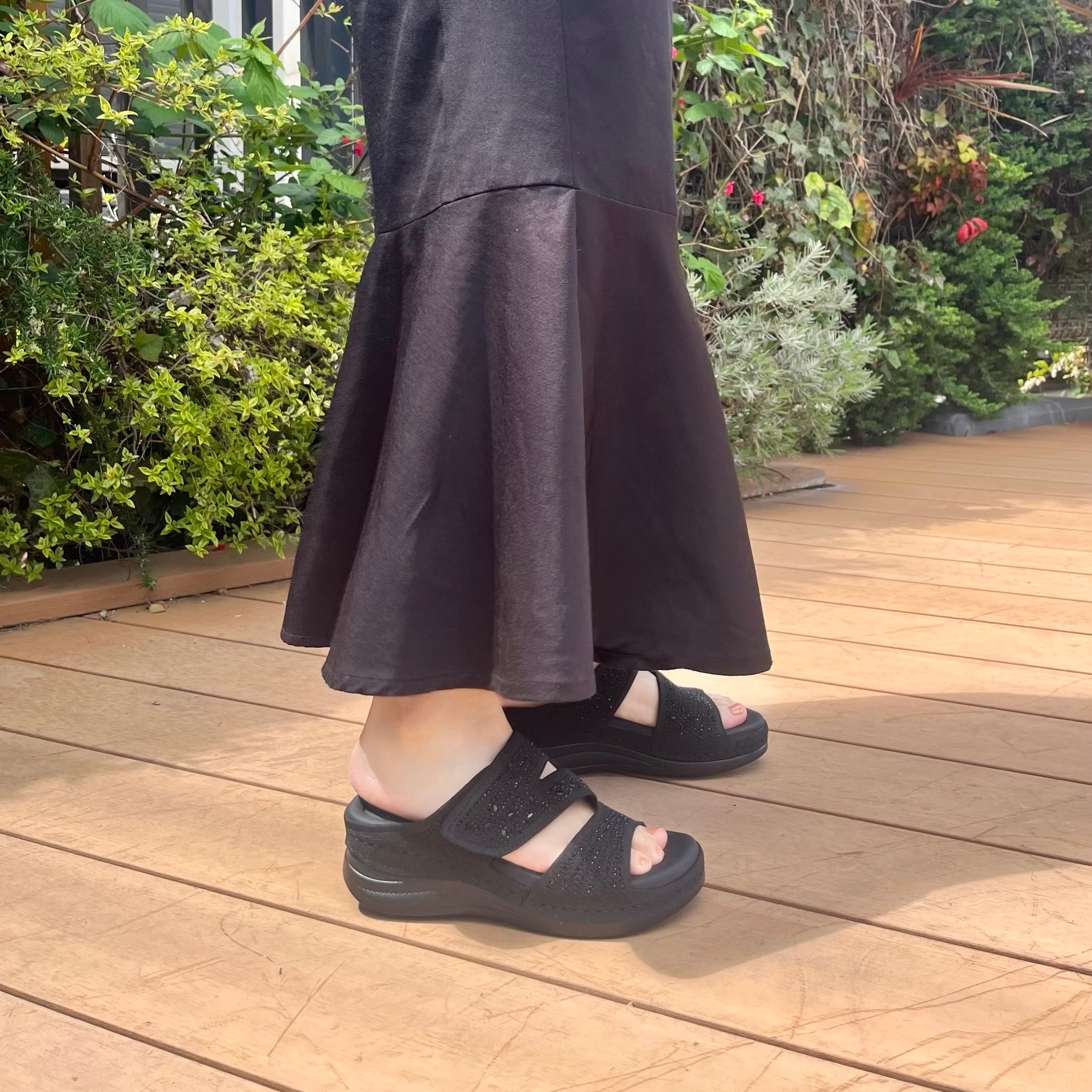 快適さとスタイルが両立したふわふわインソール厚底サンダル。軽やかな厚底デザインがどんなコーディネートにも華やかなアクセントを加えます。ミュールタイプでサッと履け、甲部分はマジックテープで調節可能です。暑い季節のお出かけやリラックスしたい時間にピッタリな一足です。