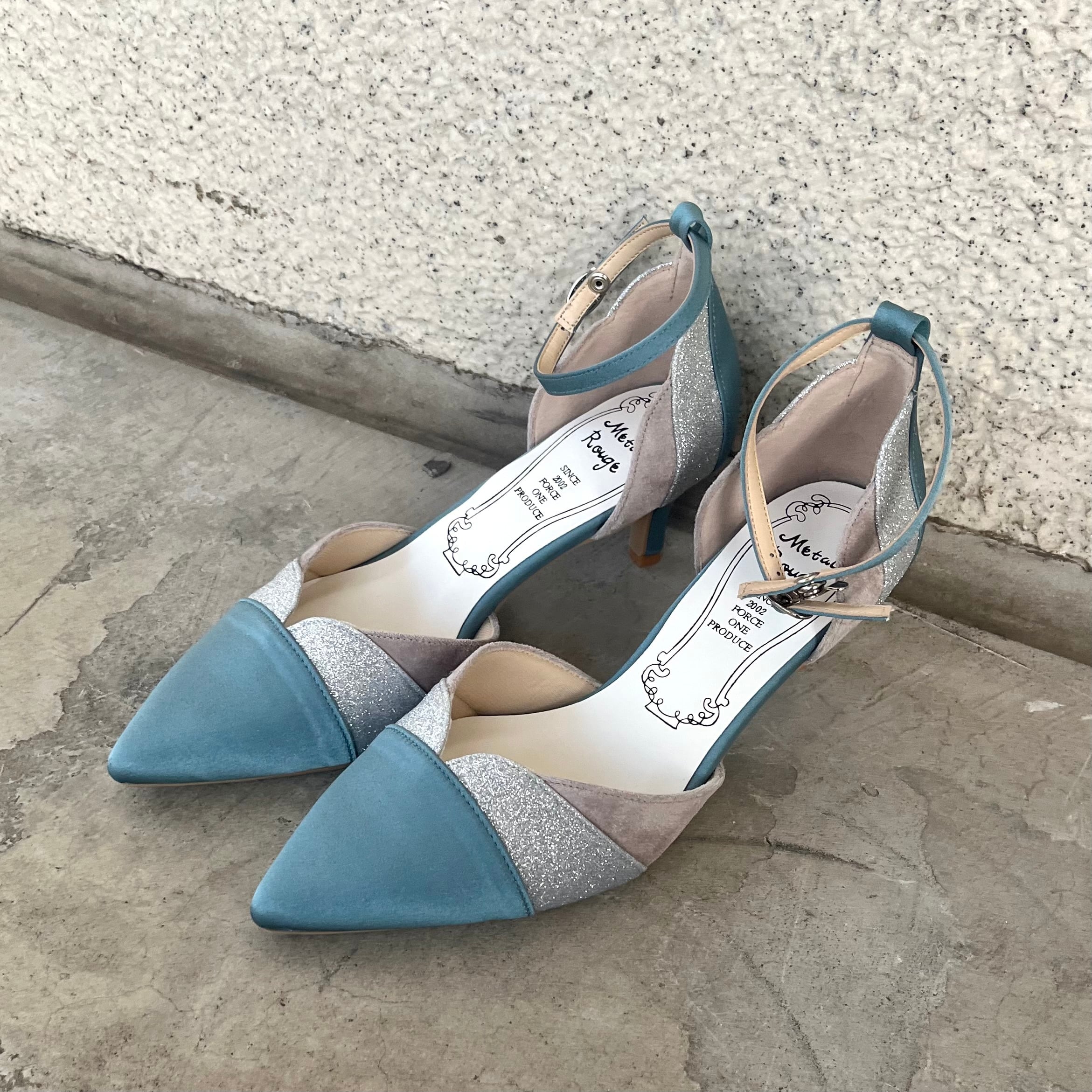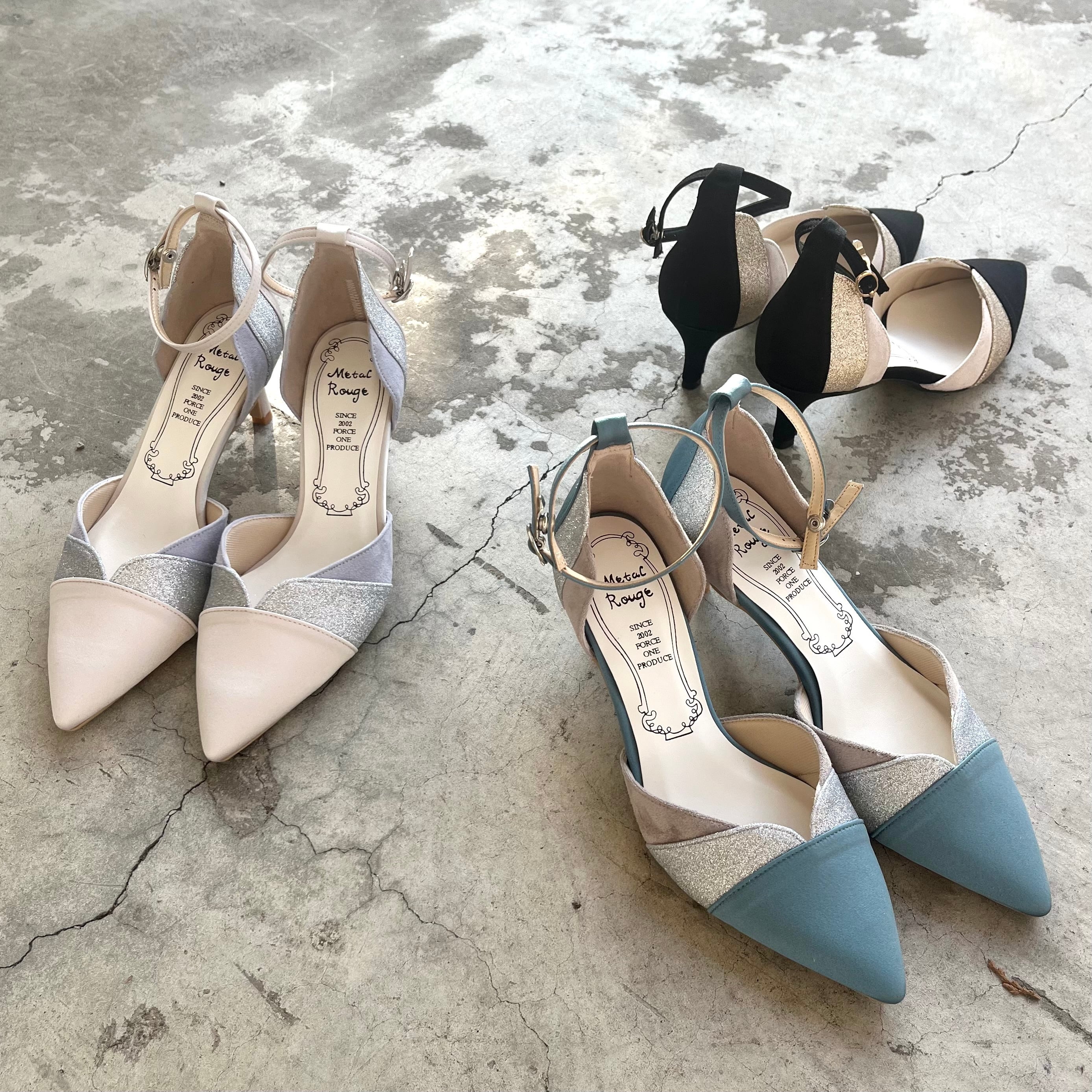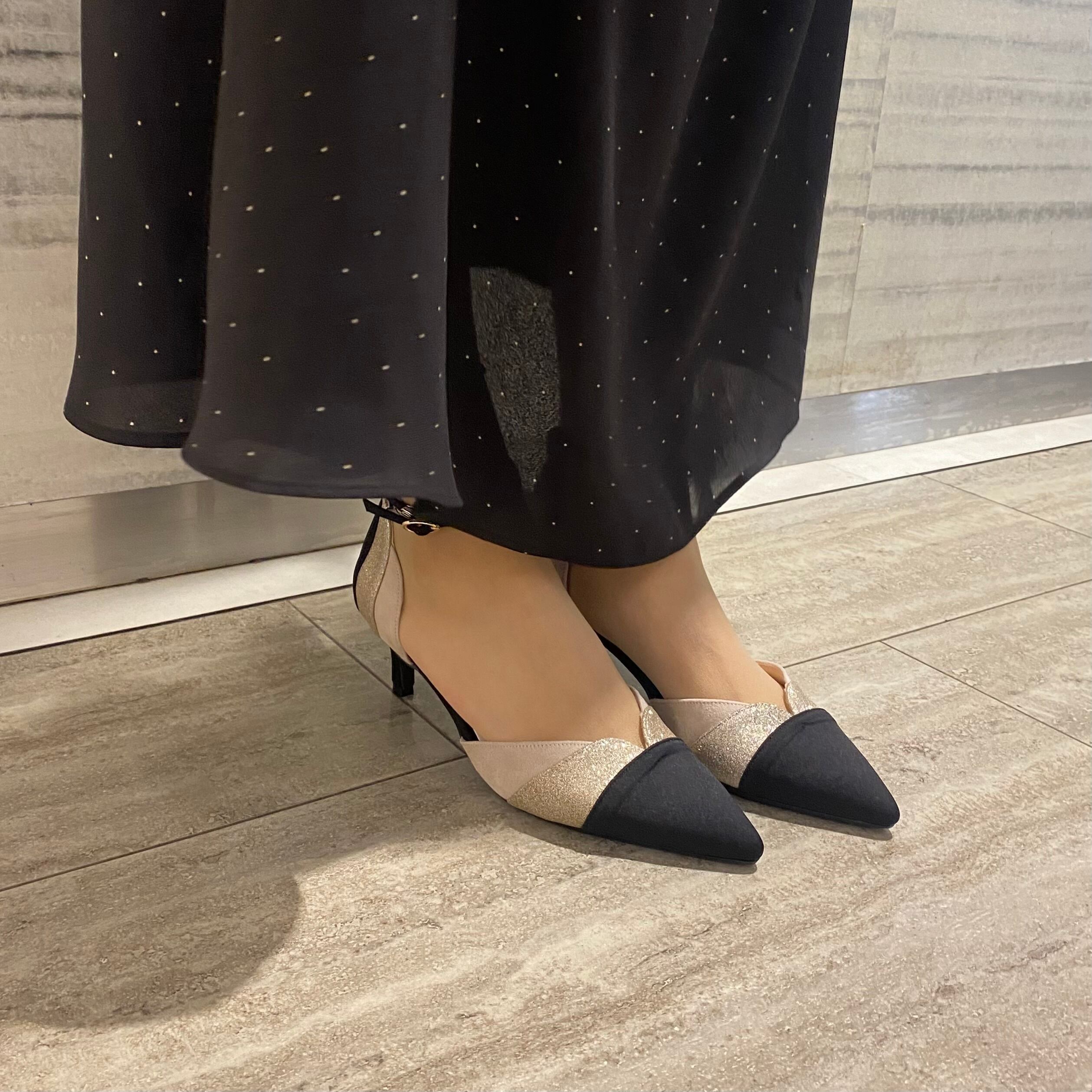 華やかなラメとセパレートデザインが魅力のパンプスです。パーティーなど特別なシーンにぴったりな一足です。また、セパレートデザインにより、足元を美しく見せることで、スタイリッシュな印象を与えます。