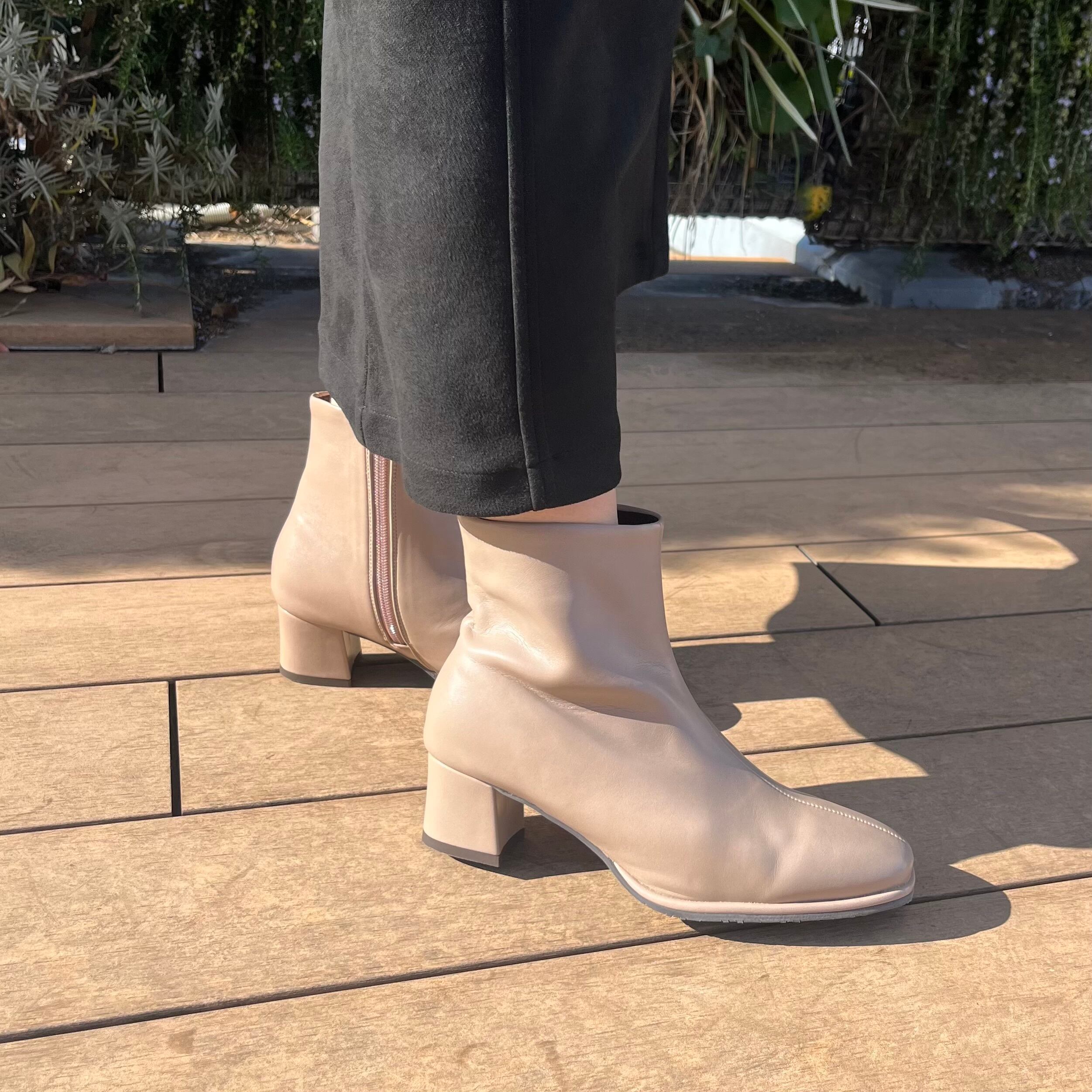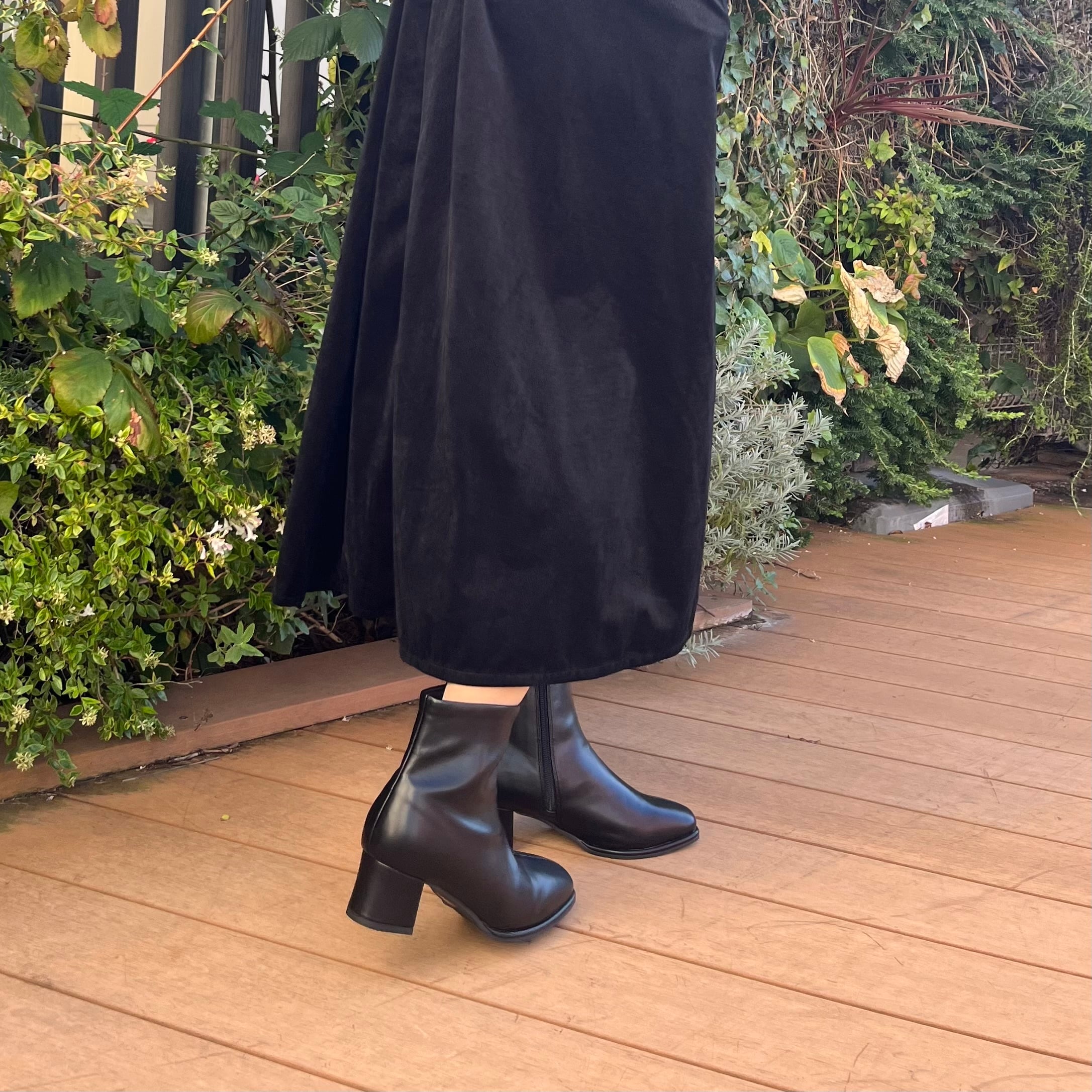 装飾のないシンプルなデザインが魅力のストレッチショートブーツは、スタイルを選ばずに大活躍するアイテムです。スクエアトゥが甘くなりすぎない印象に。チャンキーヒールは安定感があり、歩きやすさにも優れているため、1日中快適に過ごせます。カジュアルなコーディネートからオフィススタイルまで、様々なシーンにぴったりです。