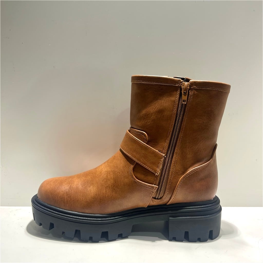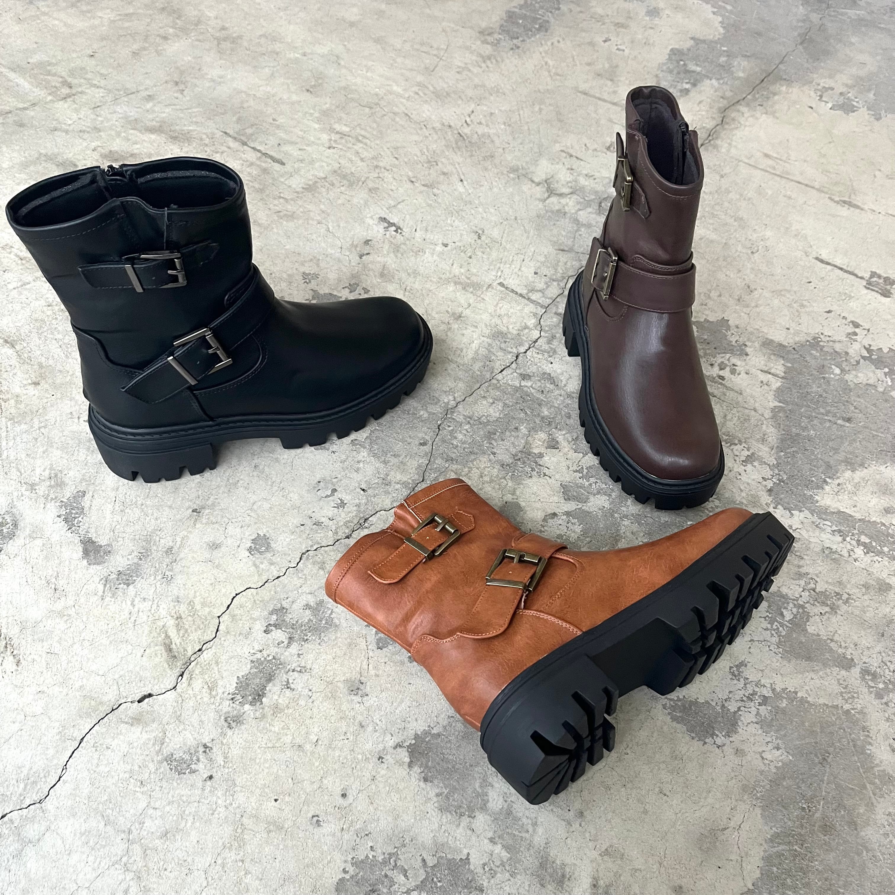 重厚感あふれるエンジニアブーツは、ボリュームのあるソールとベルトデザインが特徴のアイテムです。クールな印象を与えるデザインも丸みのあるつま先で幅広いスタイリングにマッチ。