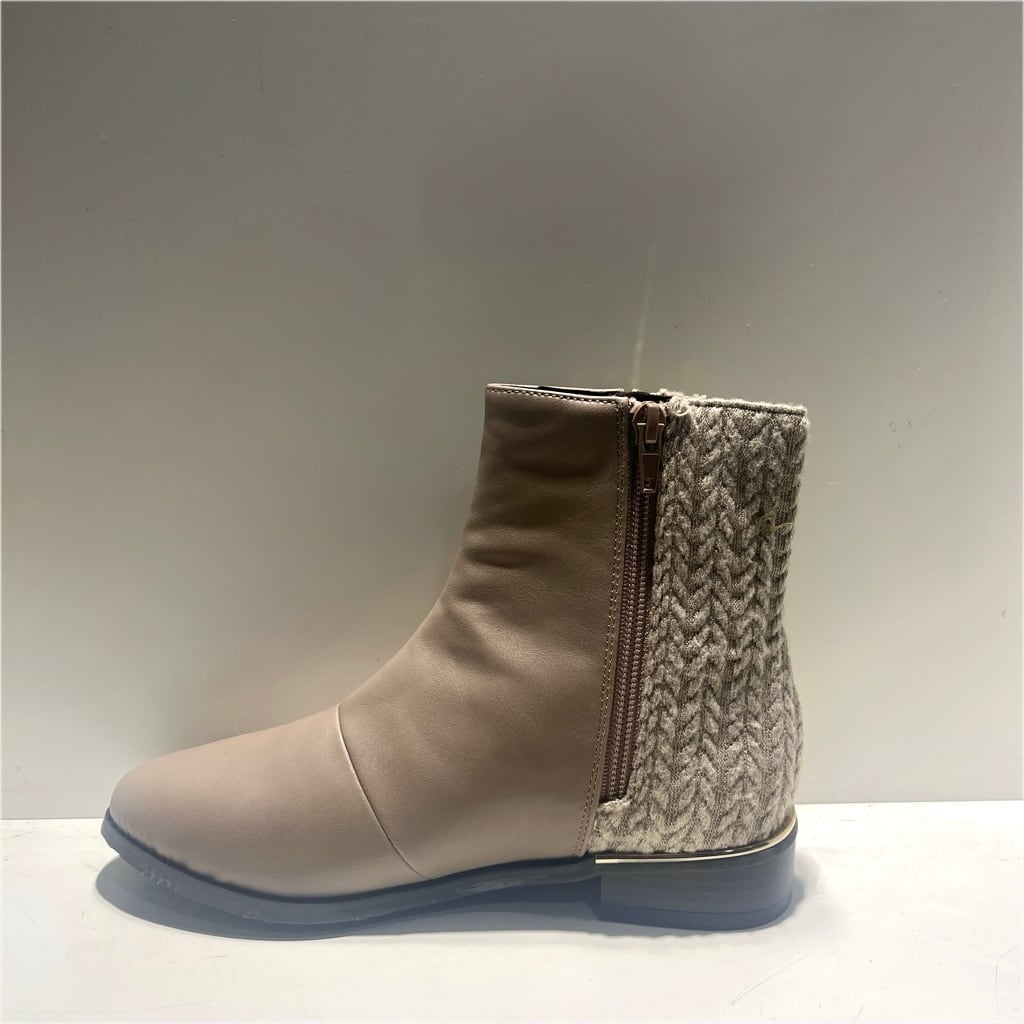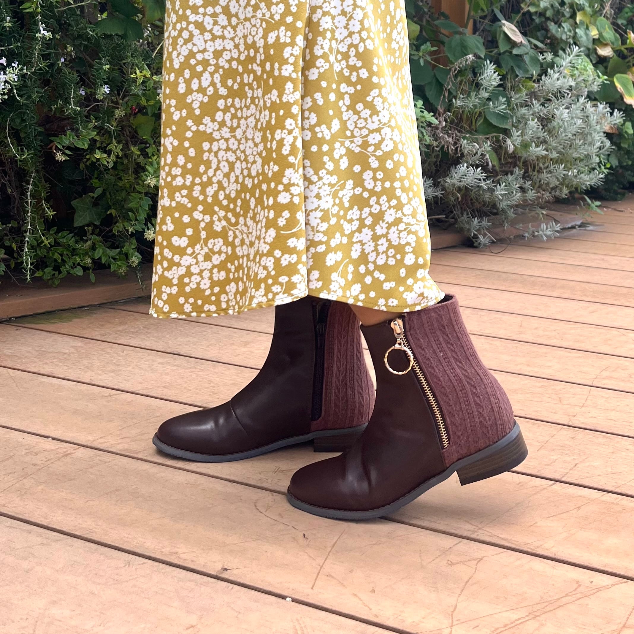 異素材コンビブーツは、昨年も人気を誇った定番デザインです。異なる素材の組み合わせが洗練された印象を与え、外側の飾りのフェイクジップもポイントになっています。ローヒールで安定感があり、日常使いにもぴったりです。