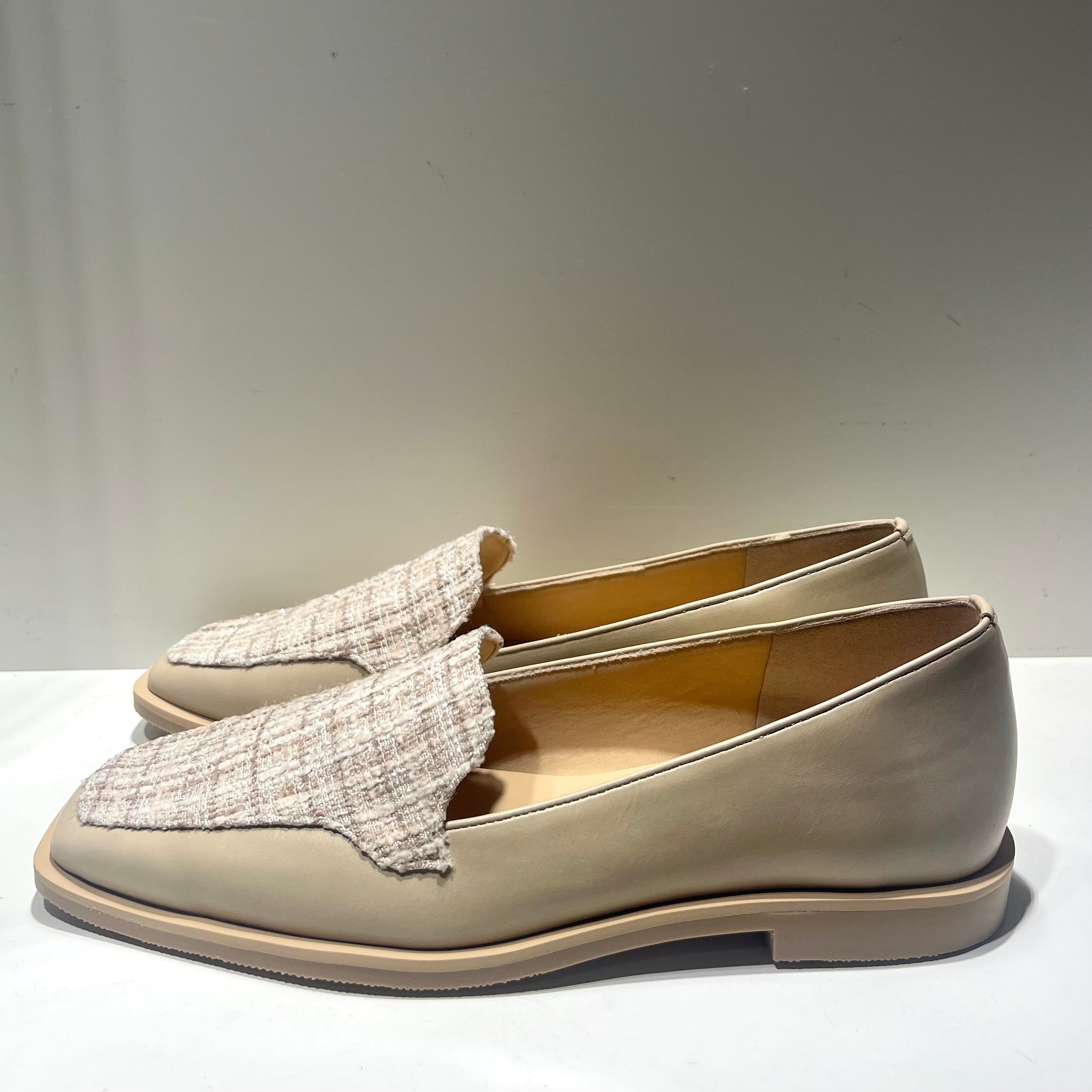 ツイード素材を使用したローヒルは、つま先が長めのデザインで足元をすっきり見せてくれるおしゃれな一足です。カジュアルなスタイルにも、フォーマルなシーンにも合わせやすく、デイリーユースから特別な日まで幅広く活躍します。また、落ち着いた風合いのツイード素材が、コーディネートに上品さをプラスします。