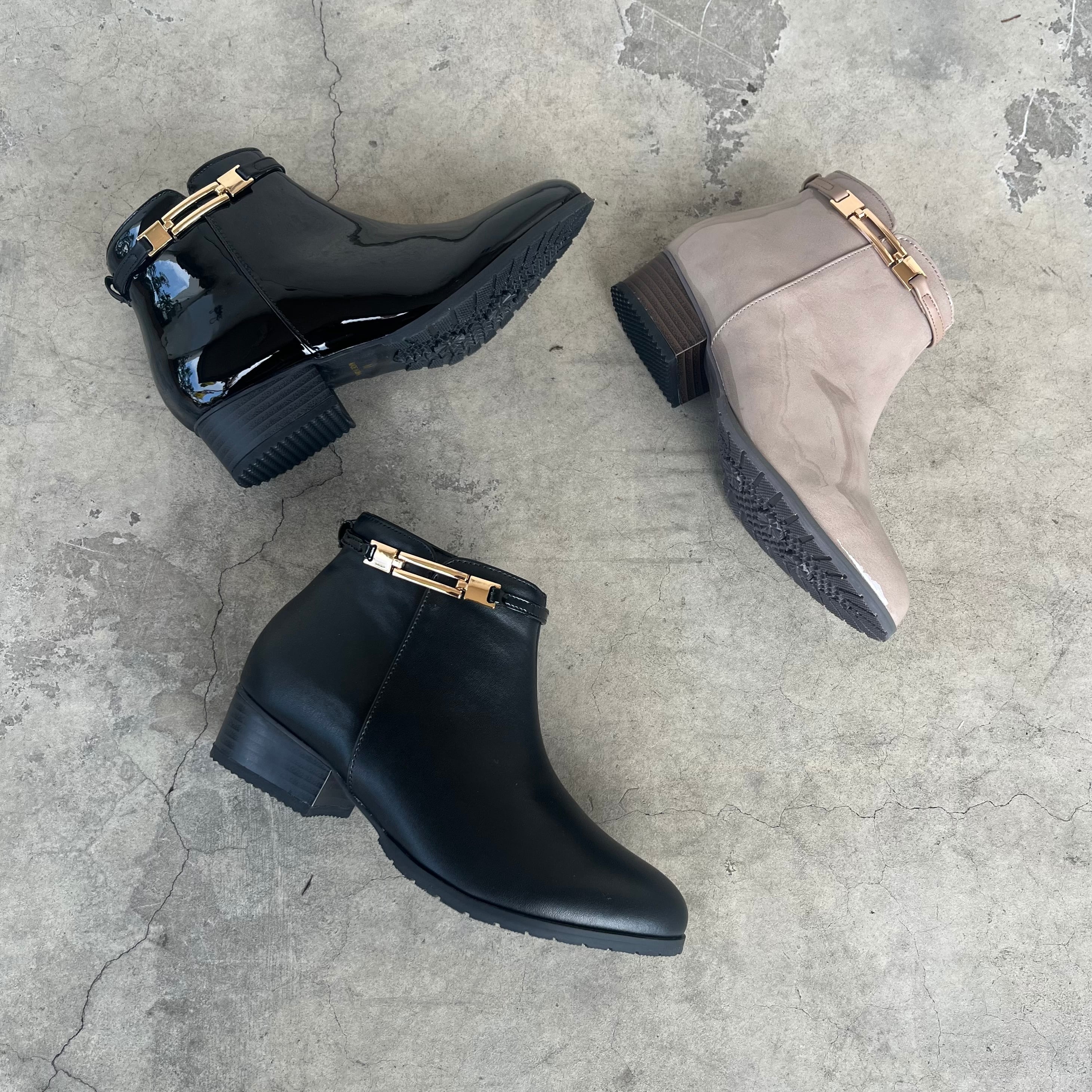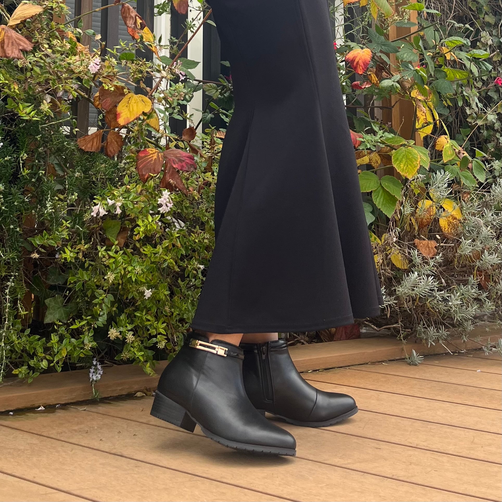 上品な見た目で、晴れの日にも映えるきれいめデザインのレインブーツです。防水シートと内側ファスナーを採用しており、雨の日も快適に過ごせます。ゴールドバックルがアクセントとなり、オフィスやきれいめコーデにもぴったりです。