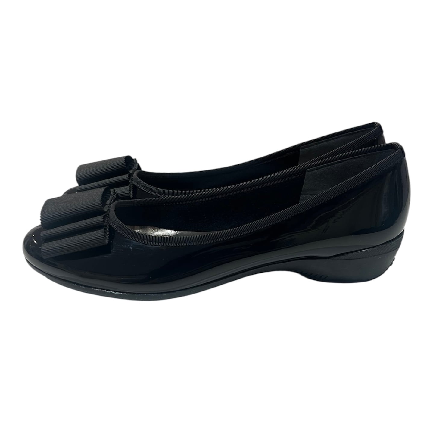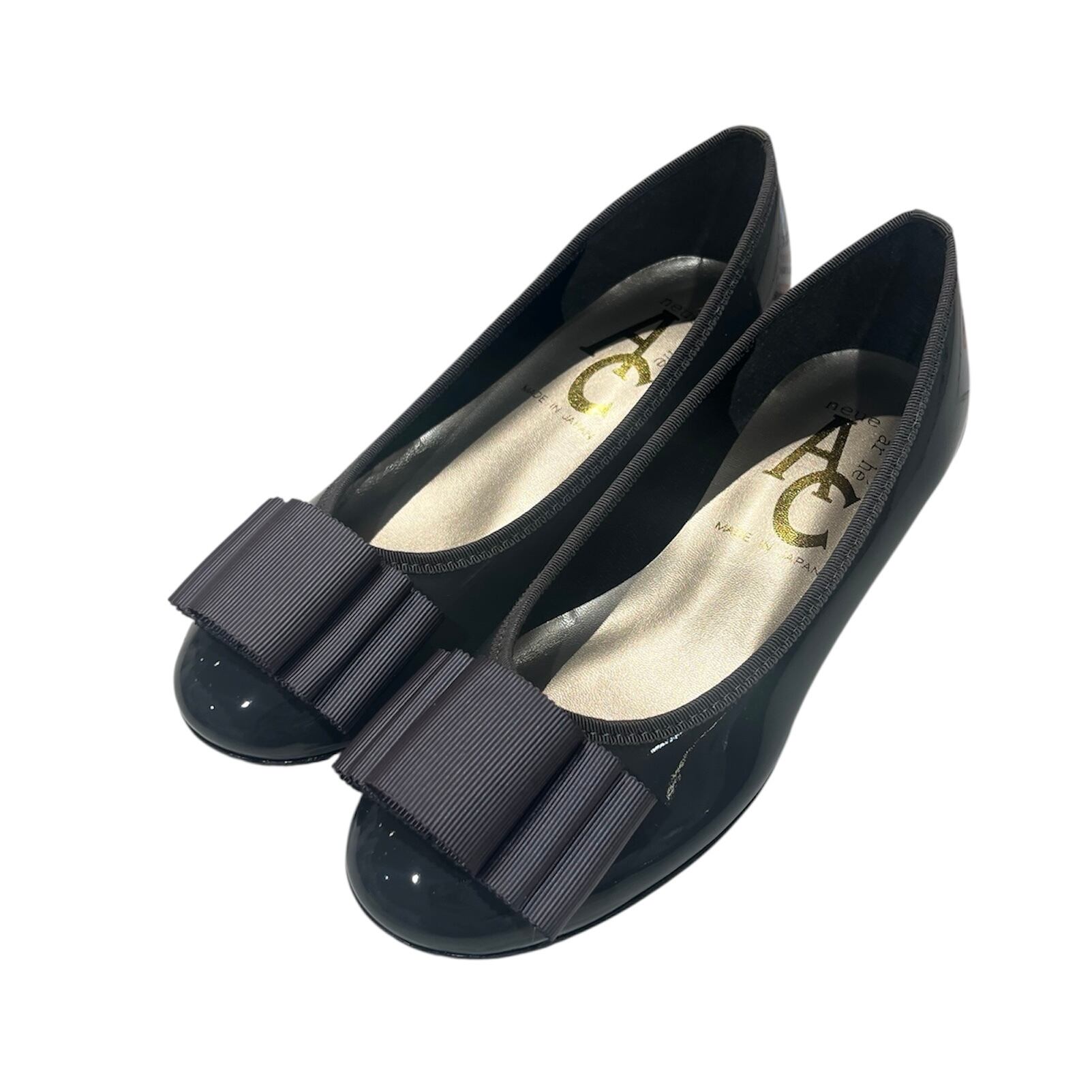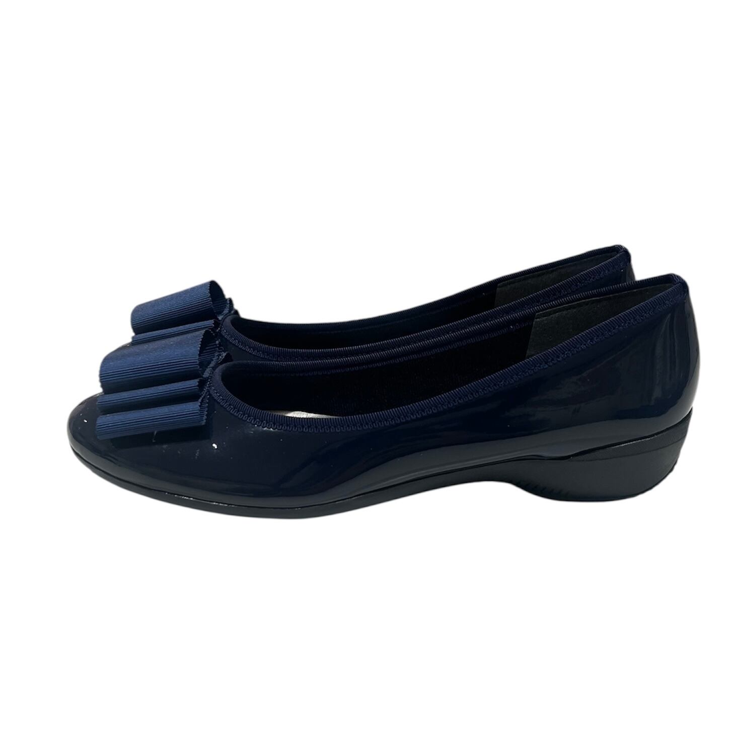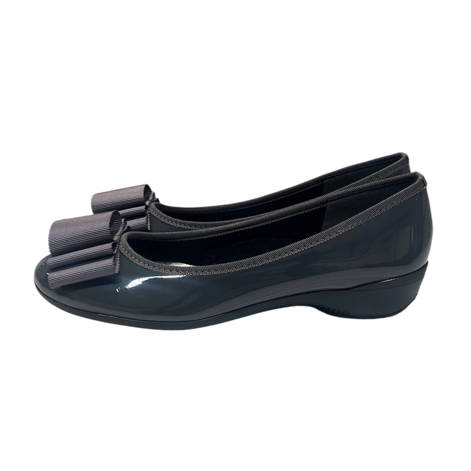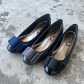 可愛らしい平リボンが特徴的なフラットパンプスです。軽量ソールを採用しているため、長時間の着用でも疲れにくく、デイリーユースに最適な一足です。柔らかなエナメル素材が足を優しく包み込み、快適さとおしゃれを両立させています。