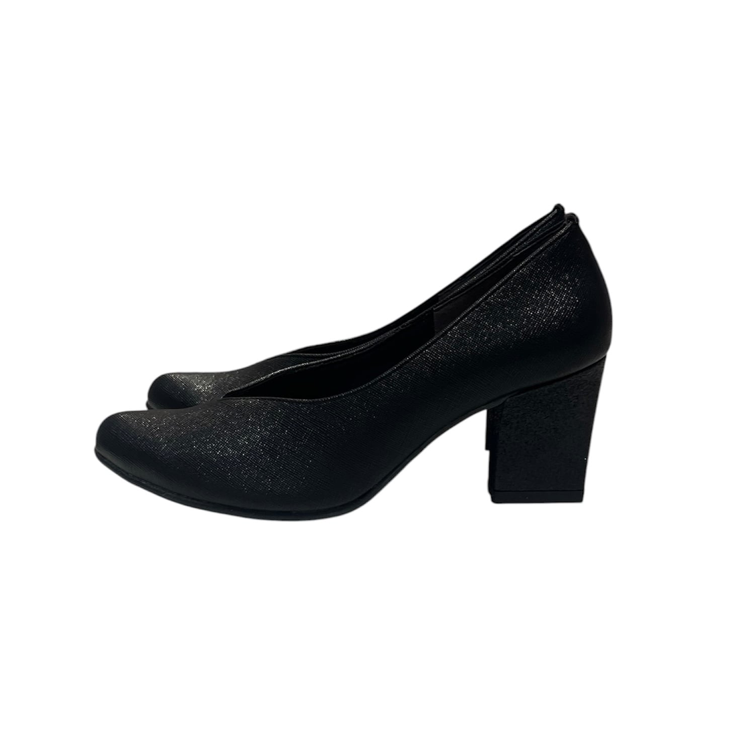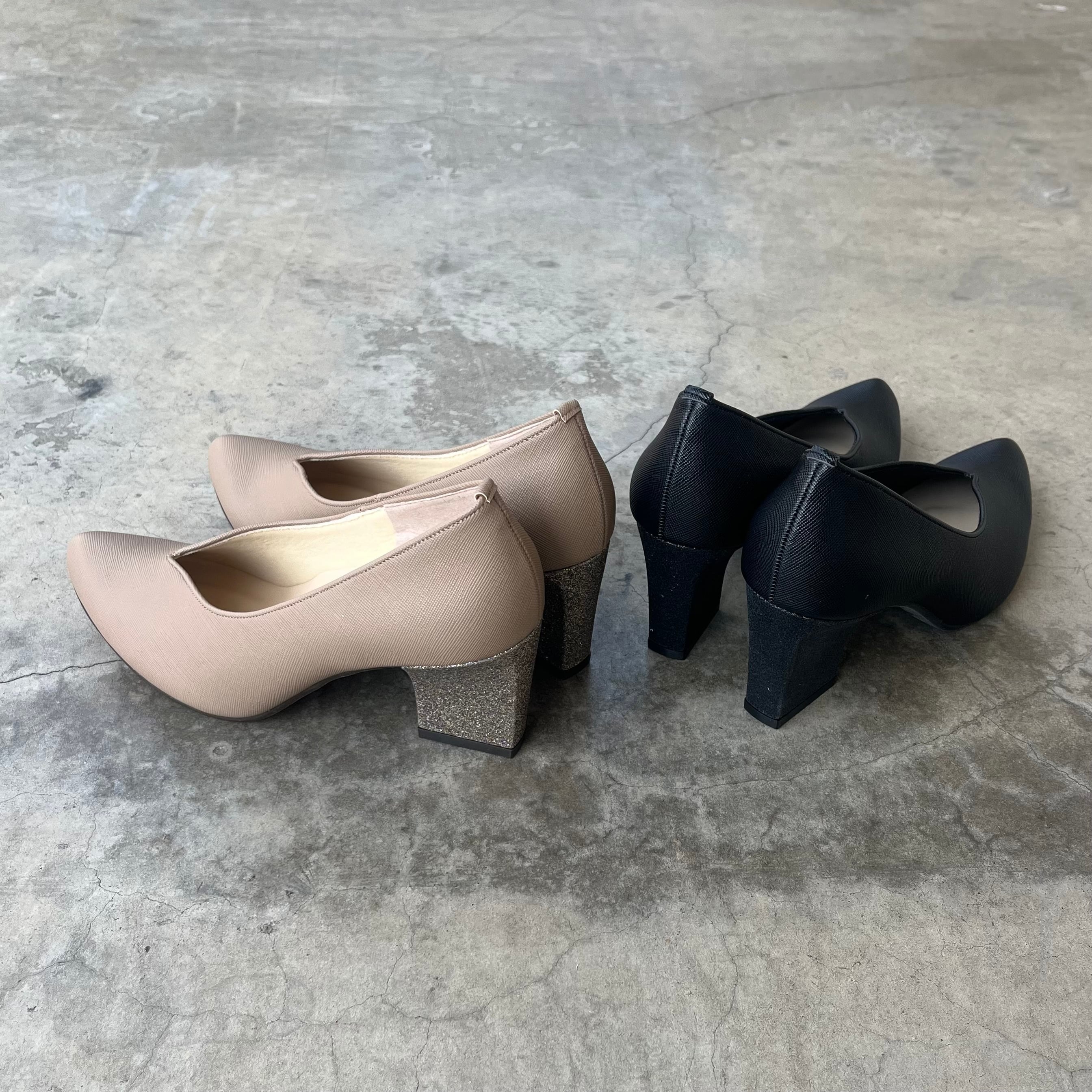華やかなグリッターヒールが目を引くグリッターヒールVカットパンプスは、Vカットデザインが足元を美しく演出します。安定感のあるスクエアヒールを採用し、長時間の着用でも快適に過ごせるのが魅力です。