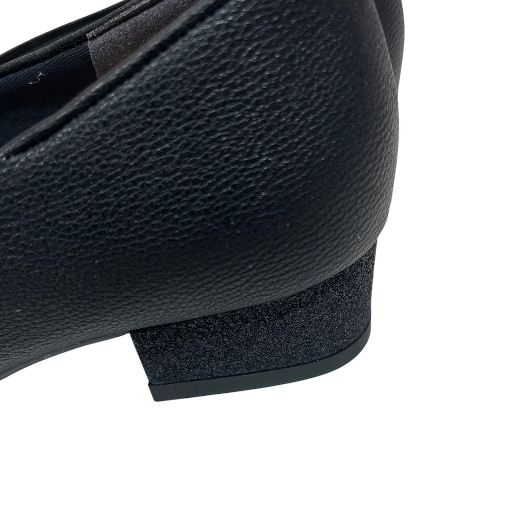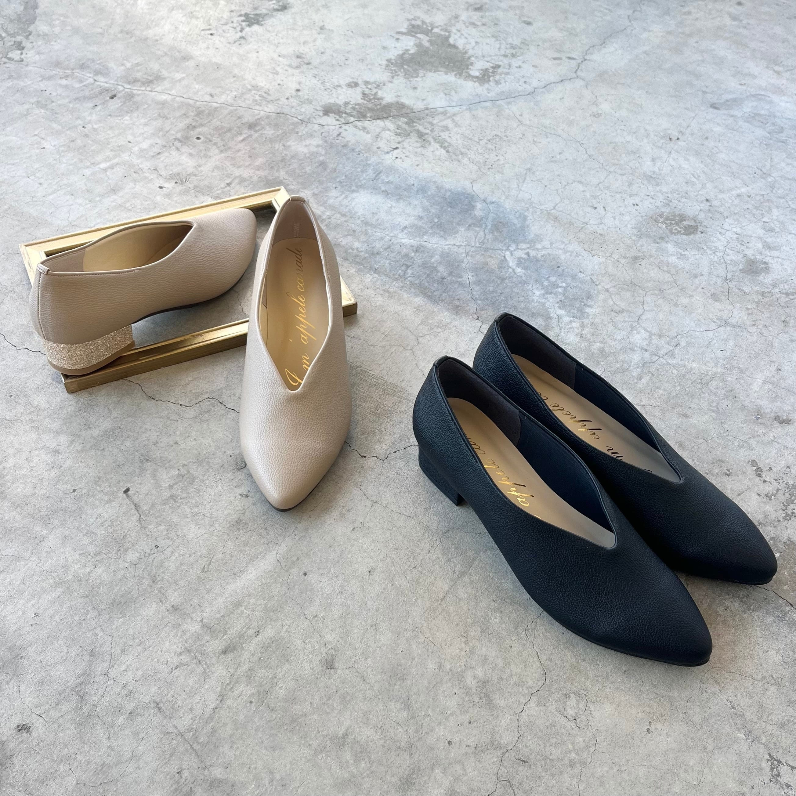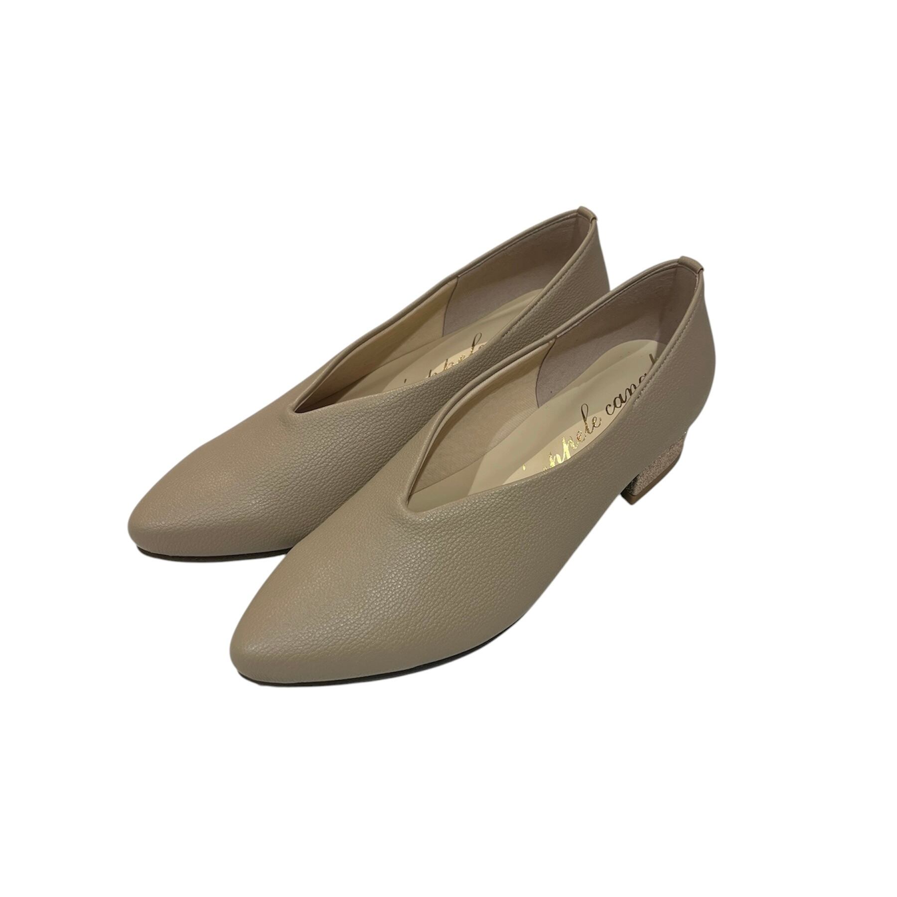 甲深Vカットパンプスは、甲をしっかり覆ったデザインが特徴の一足で、足元に上品さをプラスします。Vカットが美しいシルエットを演出し、フィット感も抜群です。華やかなグリッターヒールがコーディネートにアクセントに。