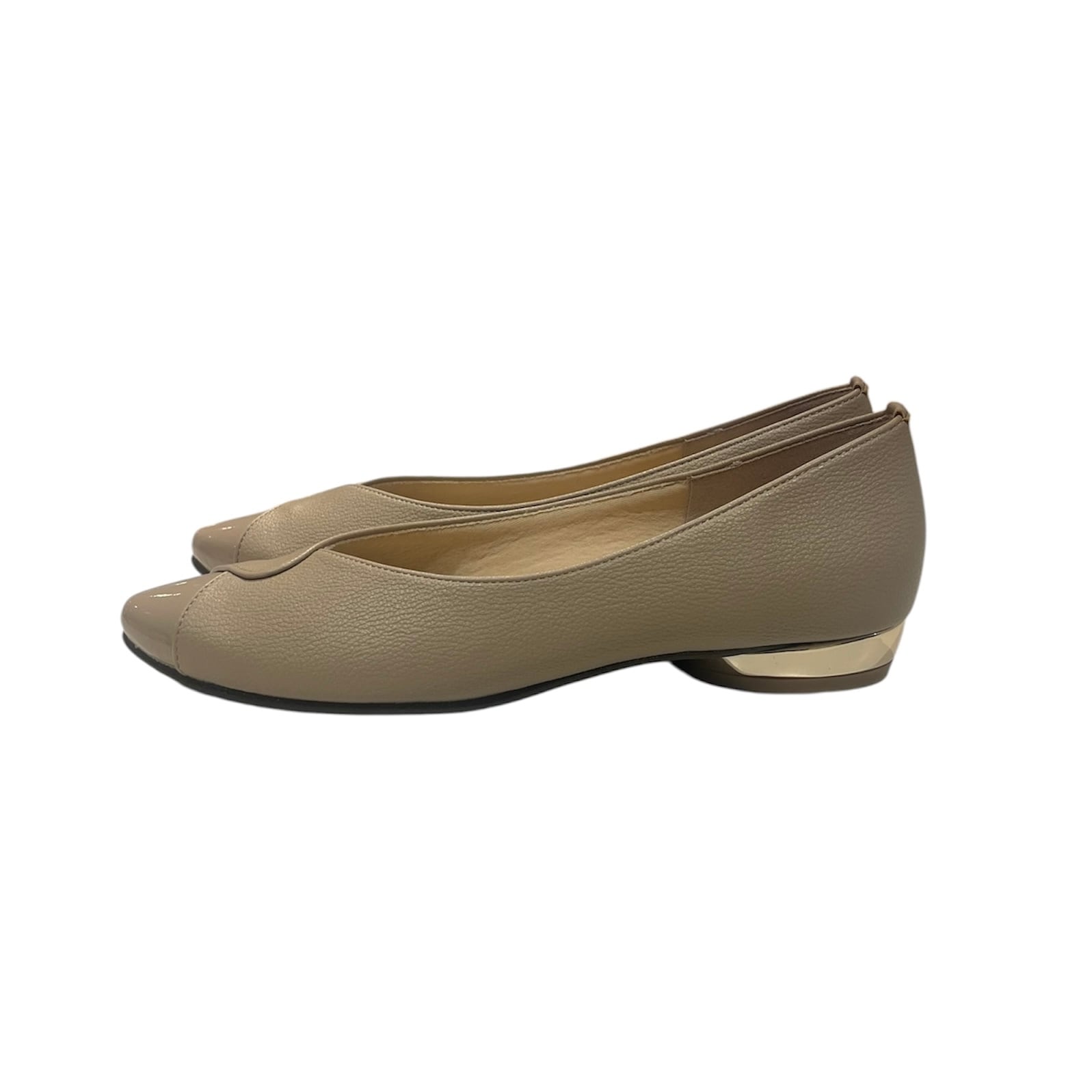 優雅なクロスラインデザインとつま先部分にエナメル素材の切り替えしが施された、洗練された一足です。柔らかな履き心地が特徴で、長時間のお出かけでも負担を感じません。丸みのあるメタルヒールがさりげないアクセントになり、カジュアルからフォーマルまで幅広いシーンで活躍します。